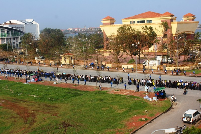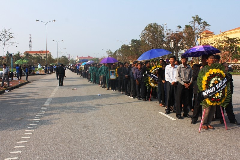 | Đoàn người tập trung tại sân của UBND tỉnh chờ gọi đến lượt mình vào viếng. |