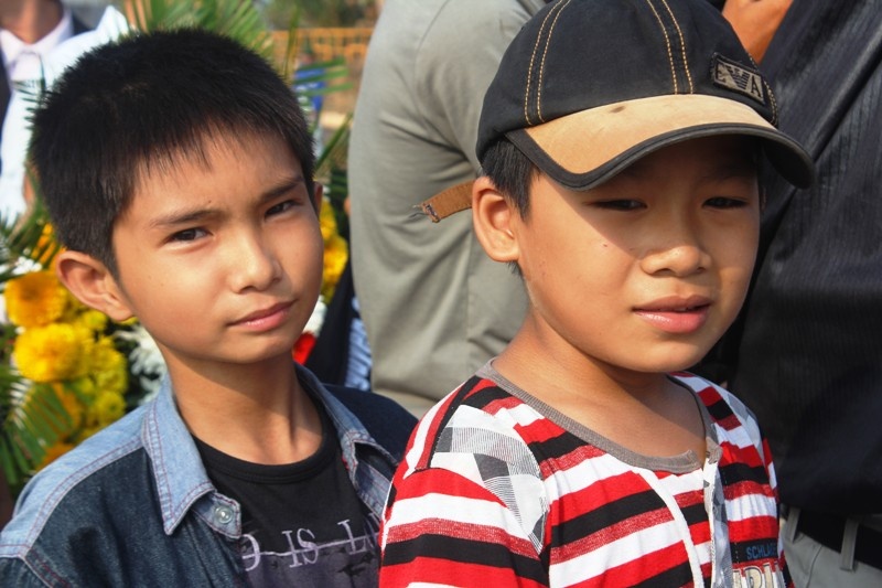 | Mặc cho trời nắng chang chang, hai em nhỏ vẫn hòa cùng dòng người xếp hàng vào viếng Đại tướng. |