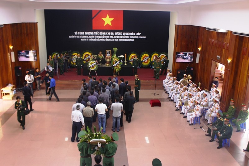 | Bên trong Hội trường nơi các đoàn thể viếng, dâng hương Đại tướng. Ảnh chụp chiều 12/10. |