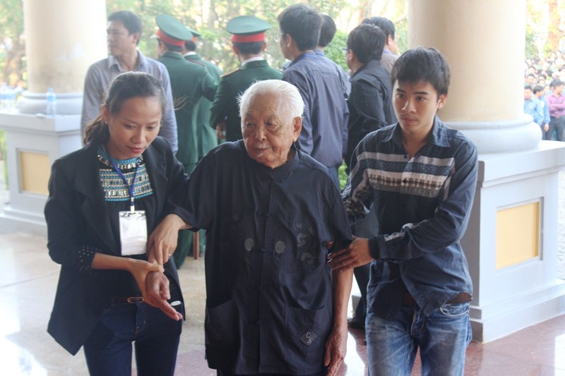 | Cụ Trần Huy, 97 tuổi, được một người cháu đưa từ xã Tiến Hóa, huyện Tuyên Hóa, Quảng Bình về Đồng Hới để viếng Tướng Giáp. Ông cho biết rất xúc động khi được ưu tiên cho vào viếng trước những đoàn đã xếp hàng từ trưa mà chưa đến lượt. |