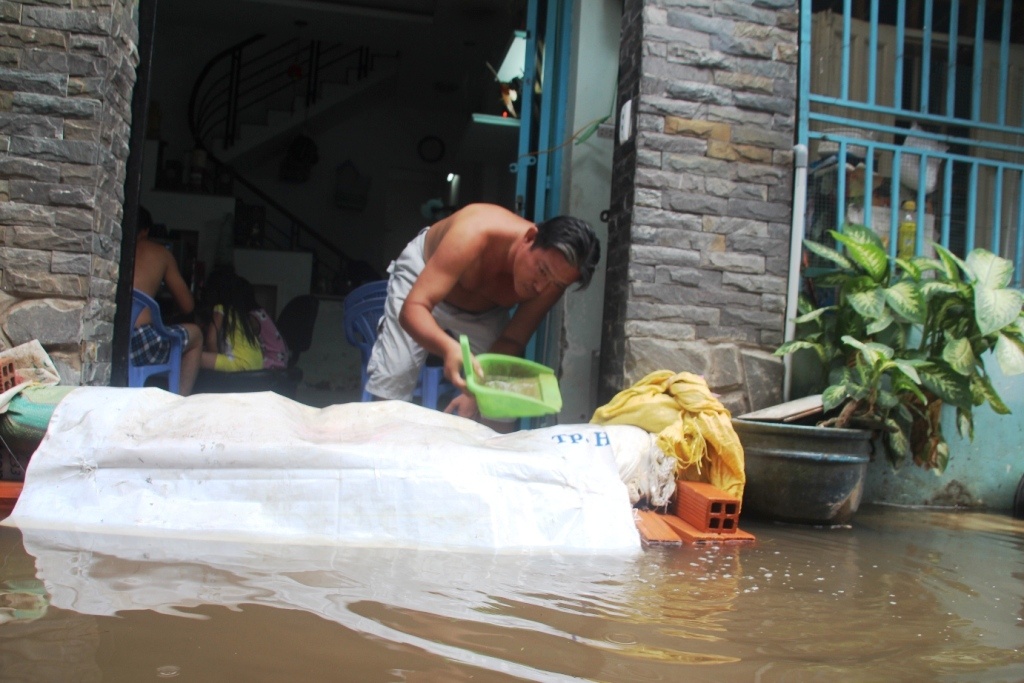 Tại quận Thủ Đức, gia đình ông Trần Thanh Tâm Bửu Ngọc (nhà 25/51/12 đường số 6, phường Hiệp Bình Phước) vẫn chưa biết thông báo cúp nước từ đêm 24 đến rạng sáng 25/10 vì phải tát nước, lau dọn nhà cửa do cơn mưa chiều tối hôm trước vẫn còn gây ngập tại đây.