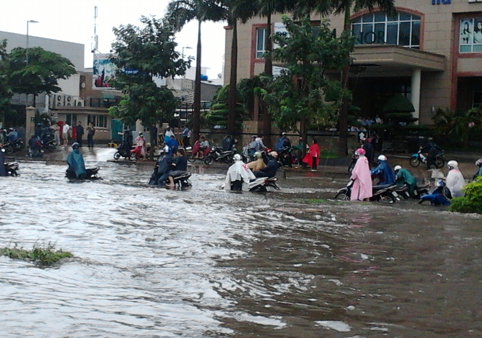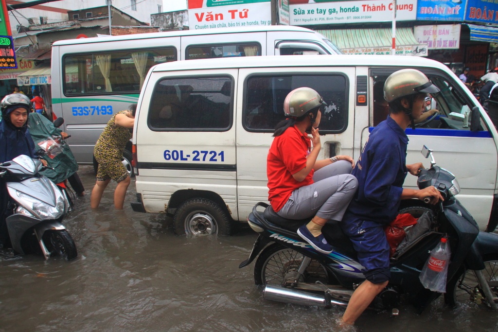 | Tại đường Nguyễn Hữu Cảnh (Q.Bình Thạnh) nước cũng ngập gần đến yên xe. Ảnh: Đỗ Nghiêm Túc. |