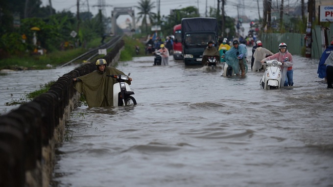 | Dù gió bão không vào đất liền nhưng ảnh hưởng của hoàn lưu áp thấp nhiệt đới gây mưa to. Từ tối ngày 6/11 đến sáng 7/11, trời Sài Gòn mưa rất to, gây ngập nhiều nơi. Trong ảnh: Người dân lội nước ở đường Kha Vạn Cân (Q.Thủ Đức) đi làm vào lúc 6h sáng nay. |