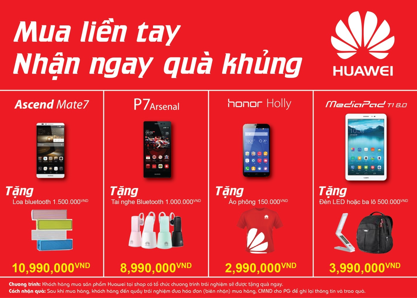 Ra mắt sản phẩm mới, Huawei dành nhiều ưu đãi và món quà hấp dẫn cho những khách hàng đầu tiên. Khách hàng mua Mate7 nhận thêm loa Bluetooth, mua P7 Arsenal có tai nghe Bluetooth, mua MediaPad T1 tặng kèm đèn LED hoặc ba-lô, mua Honor Holly có áo phông. Chương trình diễn ra hàng tuần tại các đại lý bán hàng Huawei trên toàn quốc. Facebook của hãng luôn cập nhật lịch trình và những ưu đãi trong suốt thời gian này.