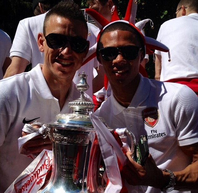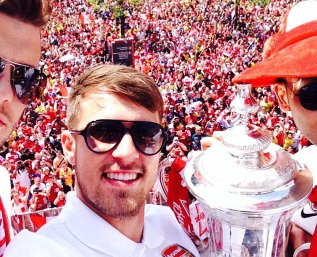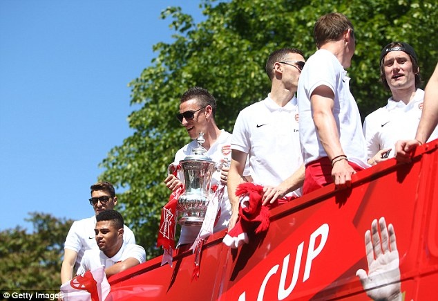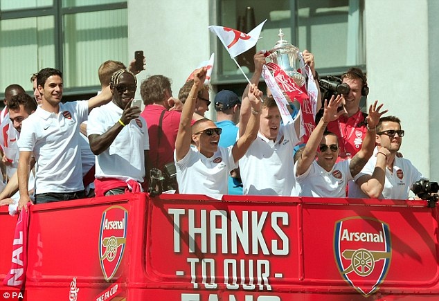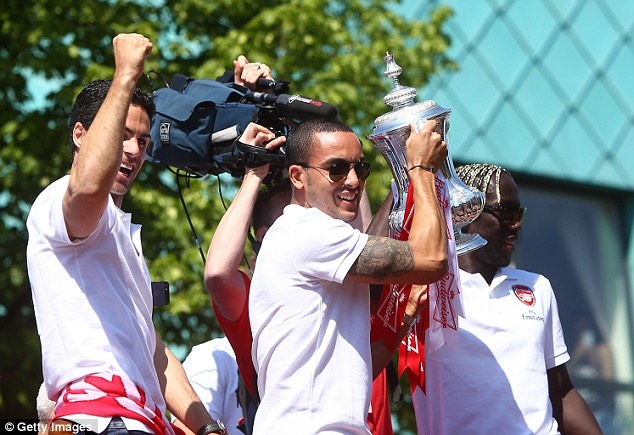 | Theo Walcott không dự trận chung kết FA Cup do dính chấn thương, nhưng anh có mặt trong buổi diễu hành ăn mừng chức vô địch của đội nhà. |