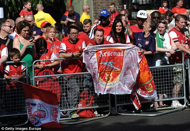 | Rất đông người hâm mộ đứng bên đường khi chiếc xe buýt chở thầy trò HLV Wenger diễu hành trên đường phố. |