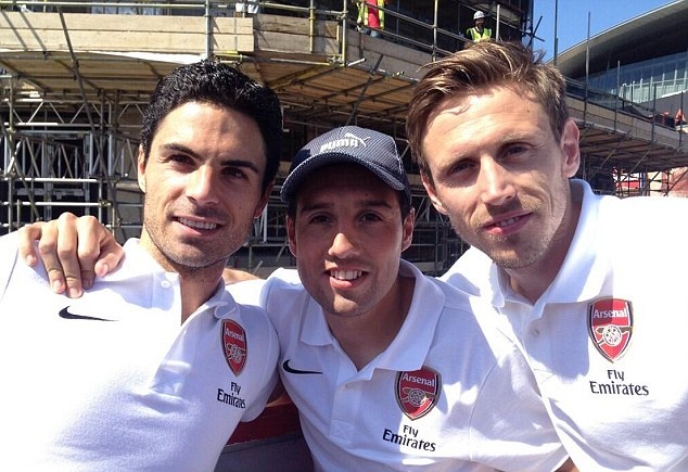 | Mikel Arteta (trái), Santi Cazorla và Nacho Monreal tranh thủ chụp hình cùng nhau. |