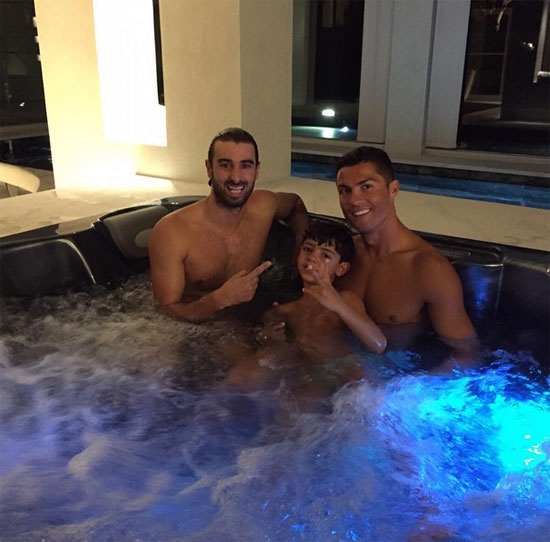 | Cậu nhóc Ronaldo Jr. tinh nghịch trong bể sục cùng CR7 và một người bạn của bố. |