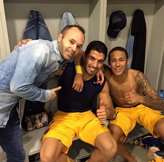 | Iniesta chia sẻ ảnh ăn mừng chiến thắng cùng 2 người hùng của trận đấu trước Getafe là Suarez và Neymar. |