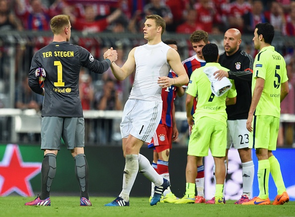 | Thủ môn Manuel Neuer chúc mừng các cầu thủ Barca giành quyền vào chung kết Champions League. |