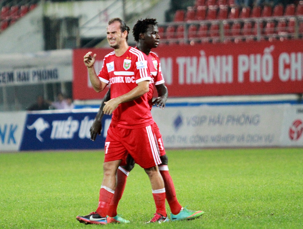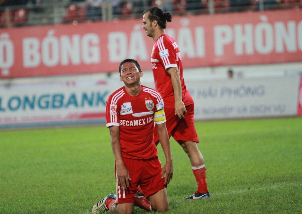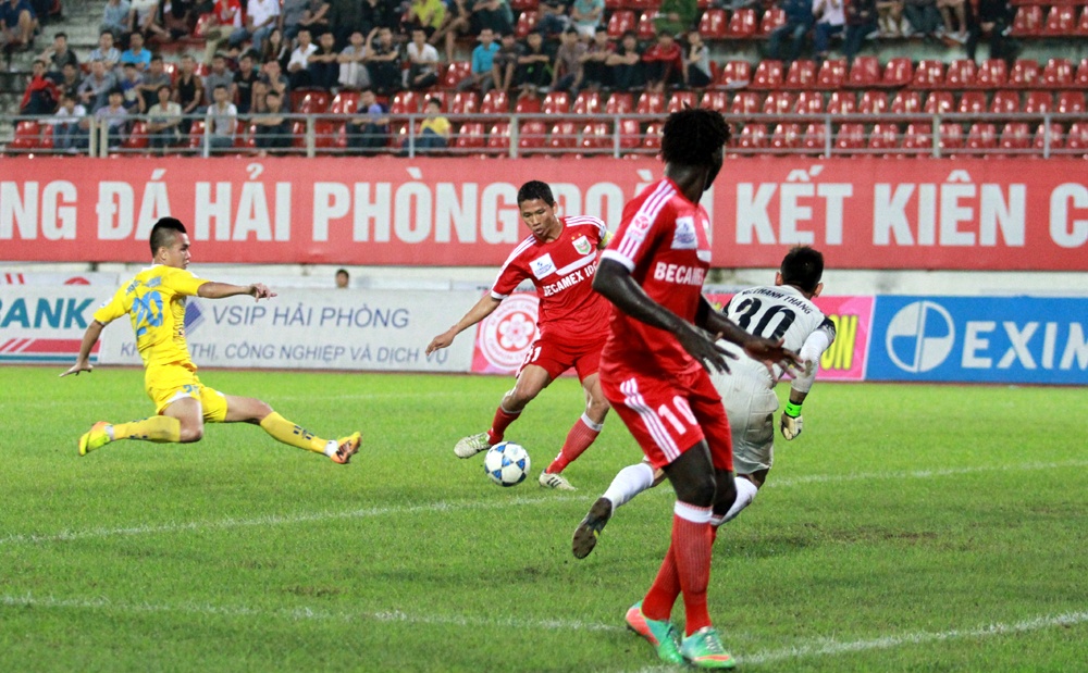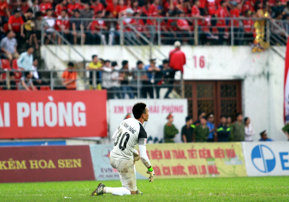 Cuối hiệp 1, Hải Phòng vùng lên tấn công mạnh mẽ. Tuy nhiên, các chân sút của họ thay nhau dứt điểm quá hiền. Thủ thành Thanh Thắng liên tục quỳ ôm đầu tiếc nuối khi các đồng đội của anh bỏ lỡ những cơ hội quá ngon ăn.