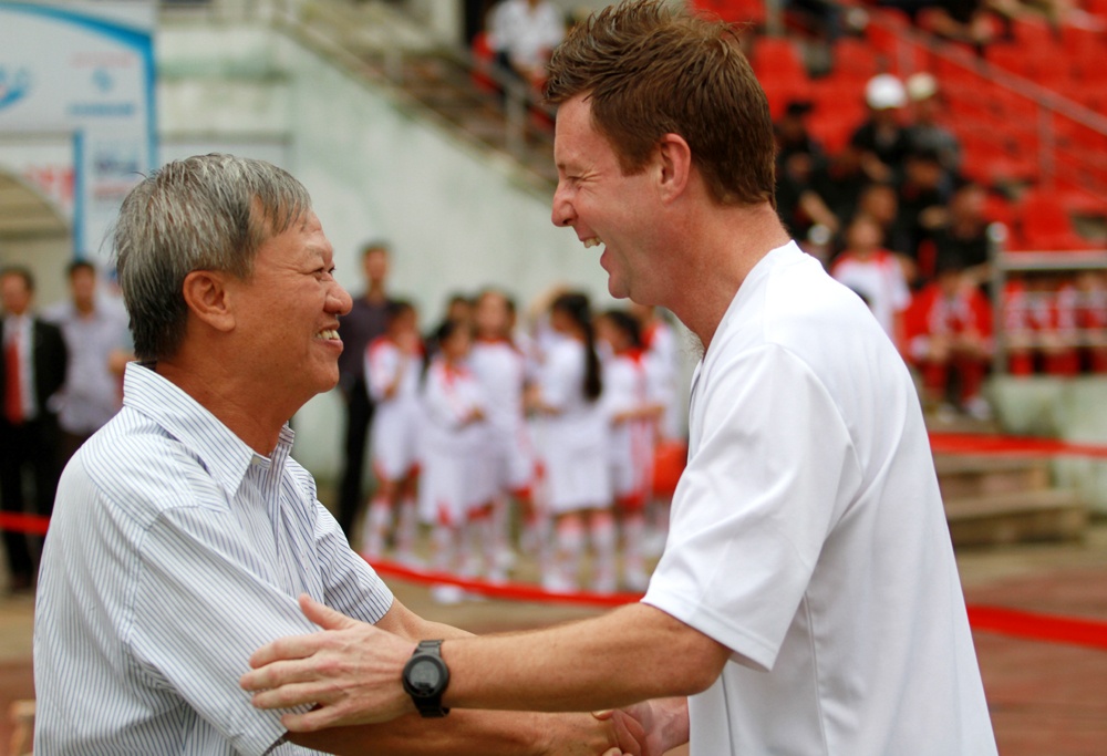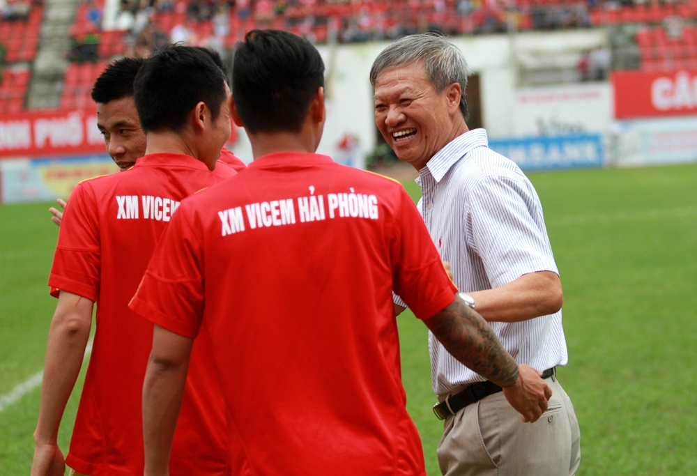 Cầu thủ Hải Phòng nồng nhiệt chào đón HLV Lê Thụy Hải khi ông cùng B.Bình Dương tới Lạch Tray.