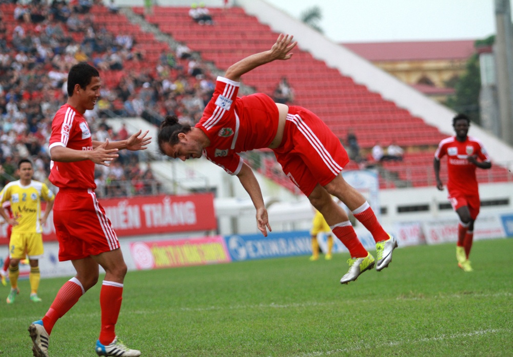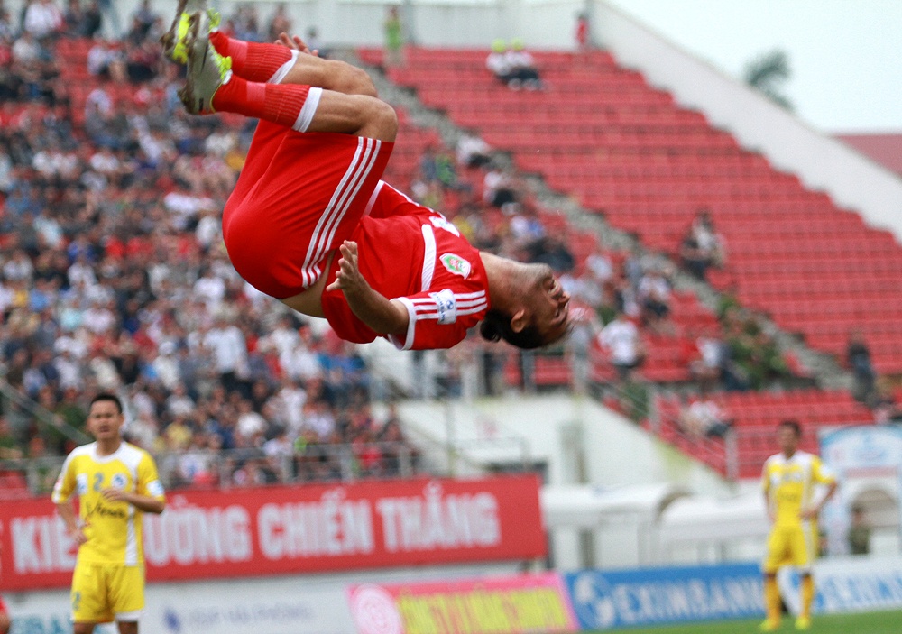 Tiền đạo nhập tịch của B.Bình Dương thực hiện màn santo ăn mừng tuyệt đẹp.