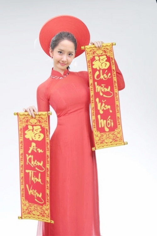 Không chỉ là thành viên trong nhóm nhạc SNSD nổi tiếng hàng đầu xứ Hàn, YoonA còn thể hiện tài năng diễn xuất qua hai bộ phim Em là định mệnh của đời anh, Love Rain. Nhân dịp Tết năm 2012, cô đã khoe vẻ đẹp quyến rũ, duyên dáng khi mặc chiếc áo dài đỏ, khăn xếp cùng hai câu đối Việt.