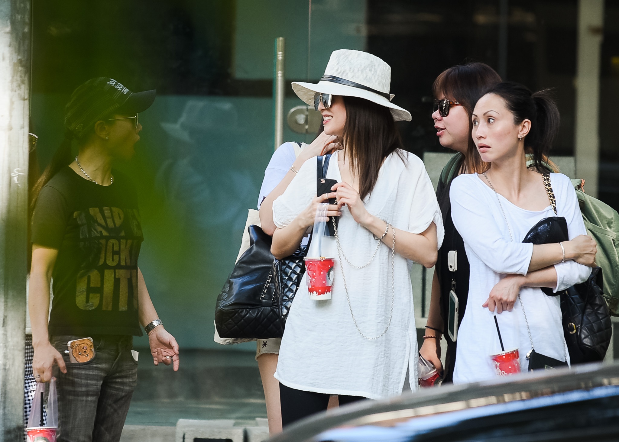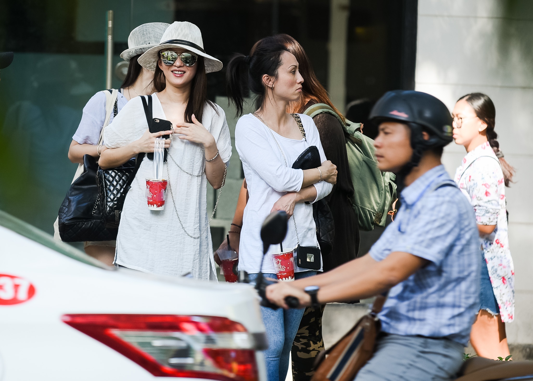 | Người đẹp xứ Đài đi chung cùng nhóm bạn. Cô đi bộ đến quán cà phê gần quán ăn để mua nước uống mang đi. |