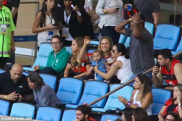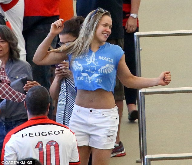 | Ronda Rousey mặc trang phục trẻ trung với quần short kết hợp với áo màu xanh. Trên khán đài sân Maracana ở Brazil, cô tỏ ra phấn khích khi thực hiện điệu nhảy samba. |