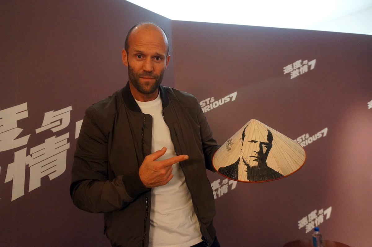 | Jason Statham bên chiếc nón lá Việt có hình vẽ chính anh. |
