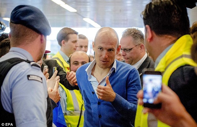 Nhân viên an ninh giúp Arjen Robben len qua đám đông để lên máy bay. |