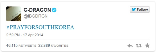 NS Yoon-G thì hy vọng các hoạt động cứu trợ được triển khai thuận lợi để có thể cứu thêm nhiều nạn nhân của vụ chìm tàu. Trong khi đó, trưởng nhóm Big Bang G-Dragon viết: "Cầu nguyện cho Hàn Quốc".
