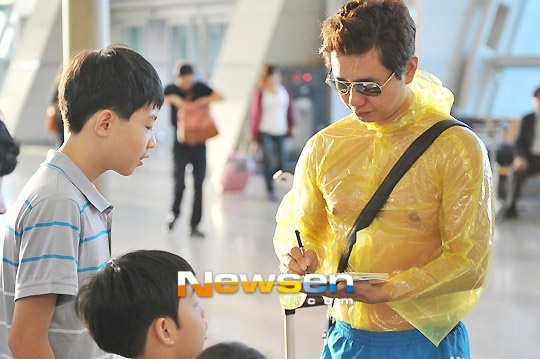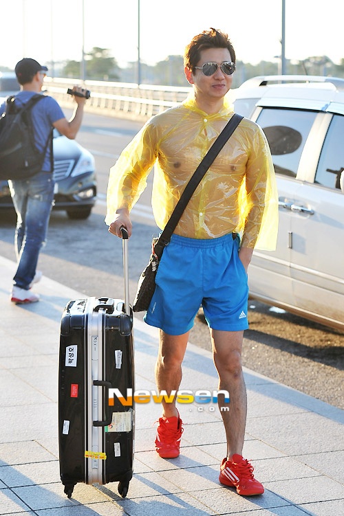 Sáng sớm 4/9, ê-kíp thực hiện Our Neighborhood Arts and Physical Education có mặt ở sân bay Incheon để chuẩn bị đến địa điểm ghi hình tiếp theo. Xuất hiện với chiếc áo mưa trong suốt màu vàng kết hợp với giày đỏ, quần xanh, Park Sung Ho làm rực cả một góc sân bay và thu hút ánh nhìn ngỡ ngàng của mọi người.
