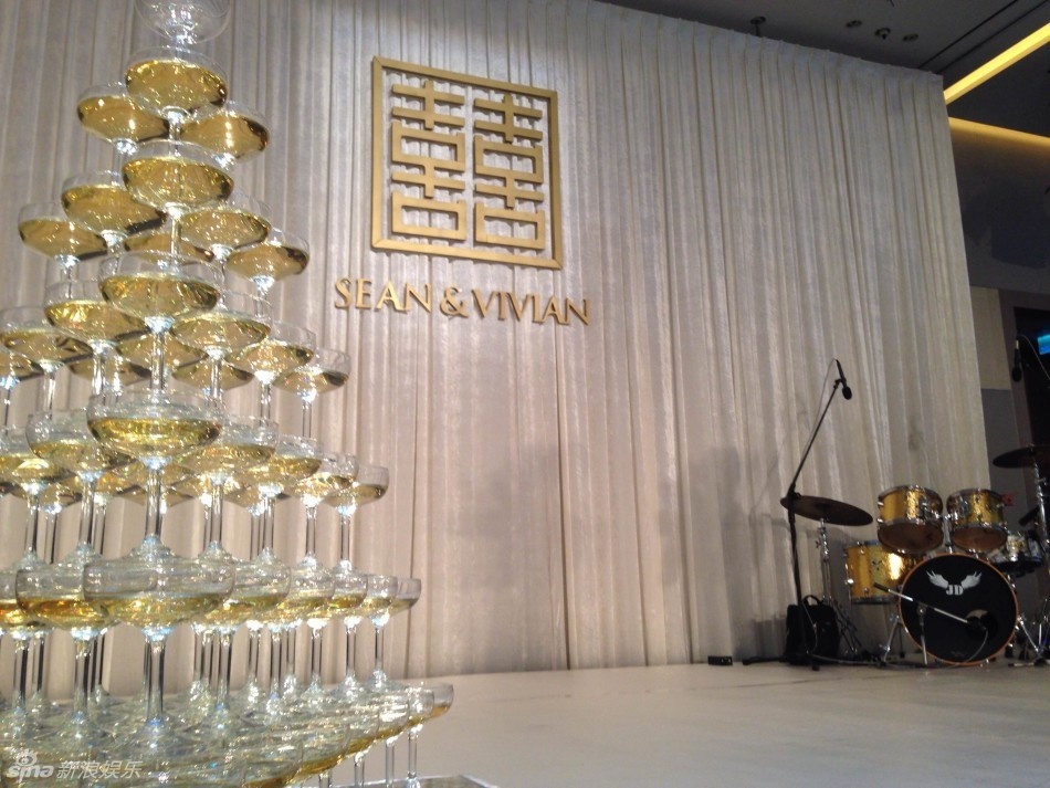 | Tiệc được trang trí bằng những tấm hình hạnh phúc của cô dâu chú rể và 2 chữ cái SV - chữ cái đầu trong tên tiếng Anh của Từ Nhược Tuyên (Vivian) và Lý Vân Phong (Sean) - khổ lớn. |