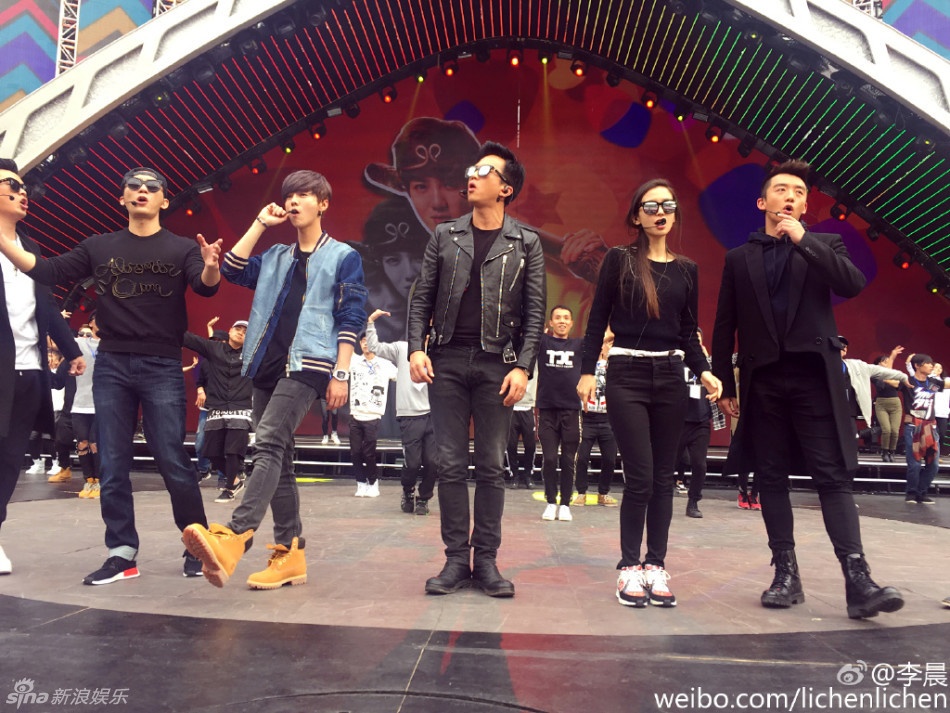 | Angelababy trong buổi tổng duyệt cùng các nghệ sĩ. Cô không đón năm mới cùng ông xã mà tham gia ghi hình cho chương trình cuối năm. |