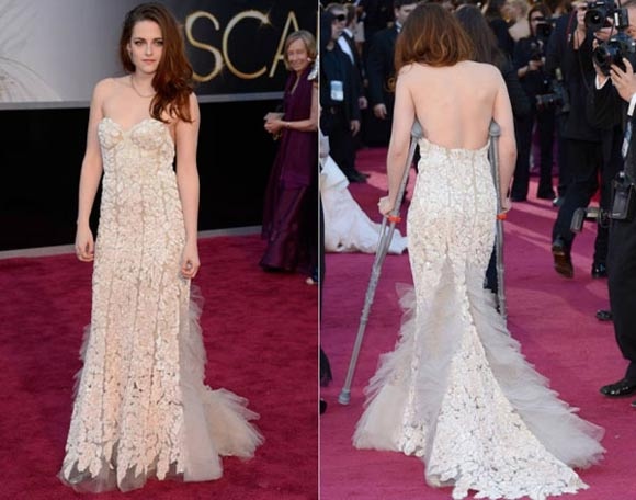 Mọi người thực sự lo lắng khi nhìn thấy Kristen Stewart một mình chống nạng trên thảm đỏ Academy Awards 2013. Cô cho biết, chân cô bị thương là do dẫm phải mảnh thủy tinh. Tuy nhiên, cô nàng vẫn rạng rỡ và khoe khéo tấm lưng nuột nà bằng chiếc váy đuôi cá tuyệt đẹp.