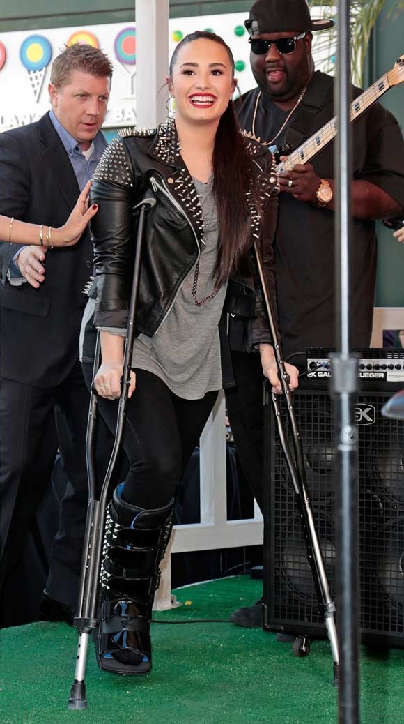 Demi từng bị thương ở chân vì bị ngã ở nhà riêng hồi tháng 2 đầu năm. Trái với vẻ mệt mỏi hay bực tức, nụ cười tươi tắn vẫn luôn nở trên môi Lovato.