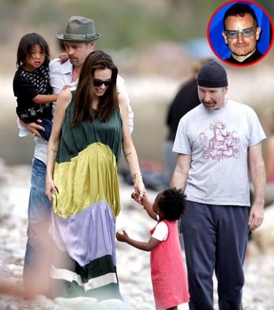 | Cặp đôi vàng Hollywood Angelina Jolie và Brad Pitt đã nhờ danh ca nổi tiếng Bono đỡ đầu cho cặp sinh đôi thiên thần của mình Knox và Vivienne năm 2008. |