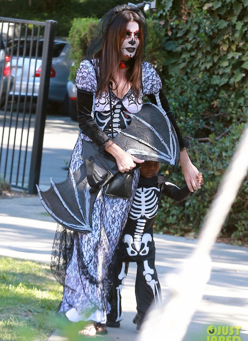 | Sandra Bullock với tạo hình Sugar Skull cùng cậu con trai David đi dự tiệc. |