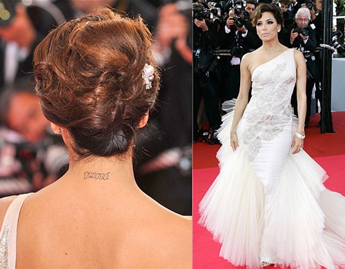 | Năm 2008, Eva Longoria xăm dòng chữ Nine - có nghĩa là 9, số áo thi đấu của chồng cô vào thời điểm đó là chàng cầu thủ bóng rổ Tony Parker. Ảnh: Getty Images |