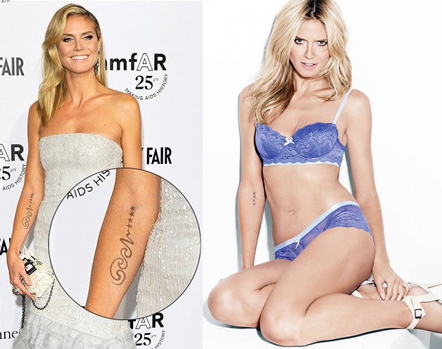 | Hình xăm này được Heidi Klum thực hiện nhân kỷ niệm 4 năm ngày cưới với chồng - nam ca sĩ Seal. "Đó là hình cách điệu chữ cái đầu tên chồng và 3 đứa con của tôi" - Heidi Klum cho biết. Năm 2011, ngay trước khi ly hôn, hình xăm vẫn rất rõ ràng trên cánh tay Heidi Klum. Tuy nhiên, đến nay, hình xăm chỉ còn là 4 ngôi sao. Ảnh: HK Intimate |