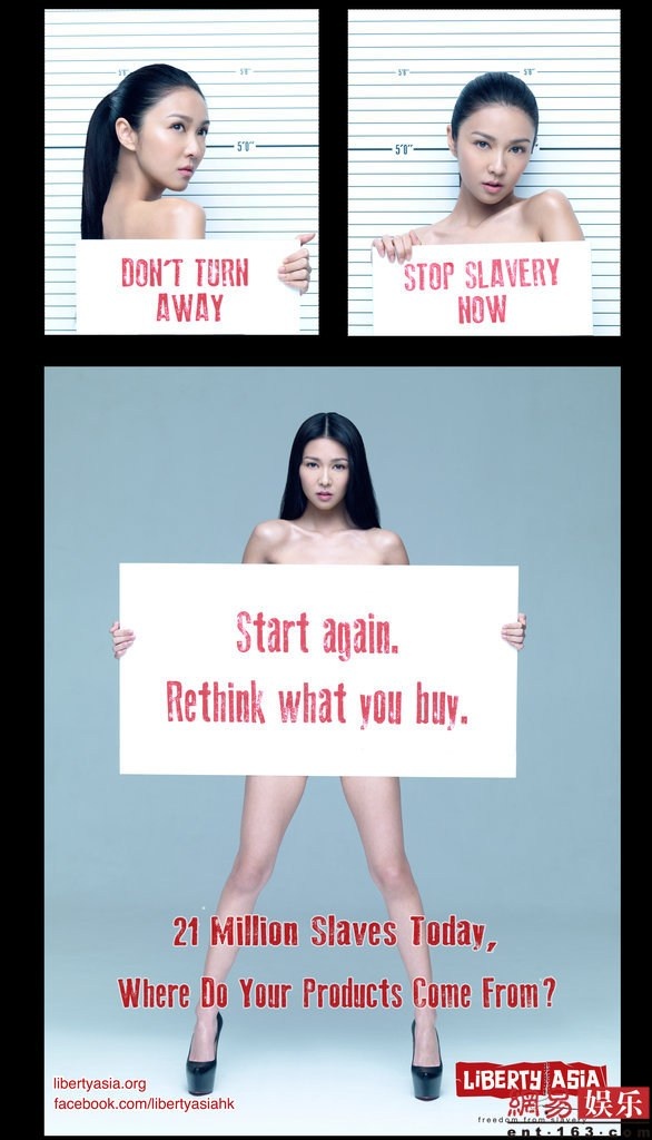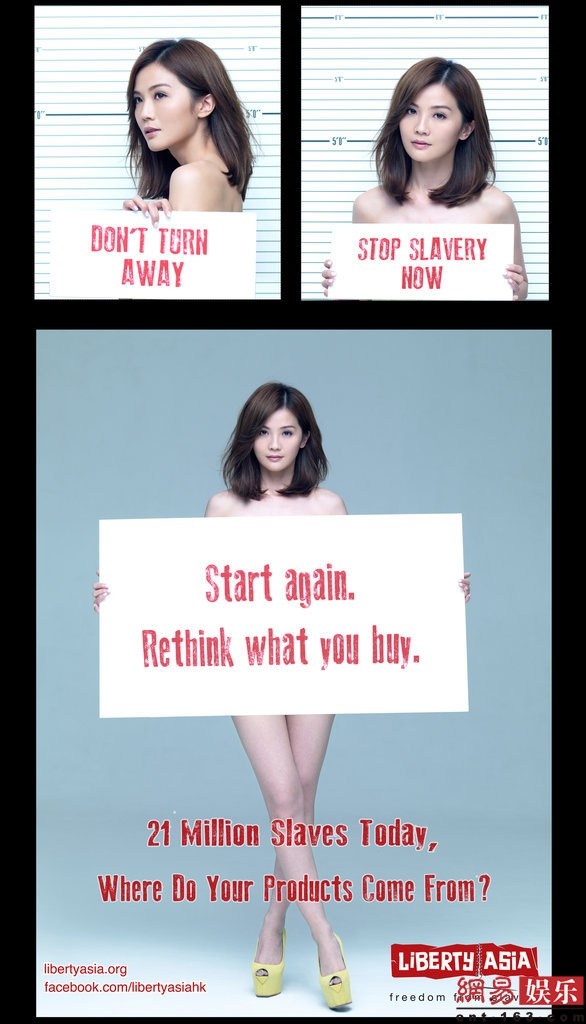 Cô gái xinh đẹp của Twins Thái Trác Nghiên, nữ diễn viên Tiết Khải Kỳ và Đỗ Văn Trạch là một trong những cái tên của showbiz Hong Kong tham gia vào sự kiện này. Dưới ống kính của nhiếp ảnh gia Wing Shya, 3 ngôi sao đều cởi bỏ trang phục và cầm tấm bảng với những lời kêu gọi mạnh mẽ như "Đừng quay đi", "Chấm dứt nạn nô lệ ngay hôm nay", "Hãy cân nhắc về hàng hóa bạn mua"...
