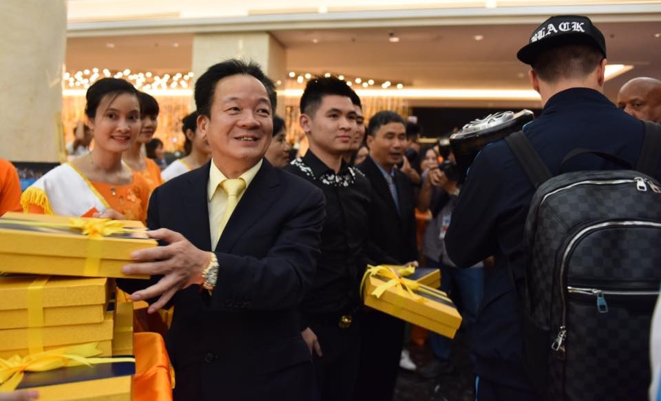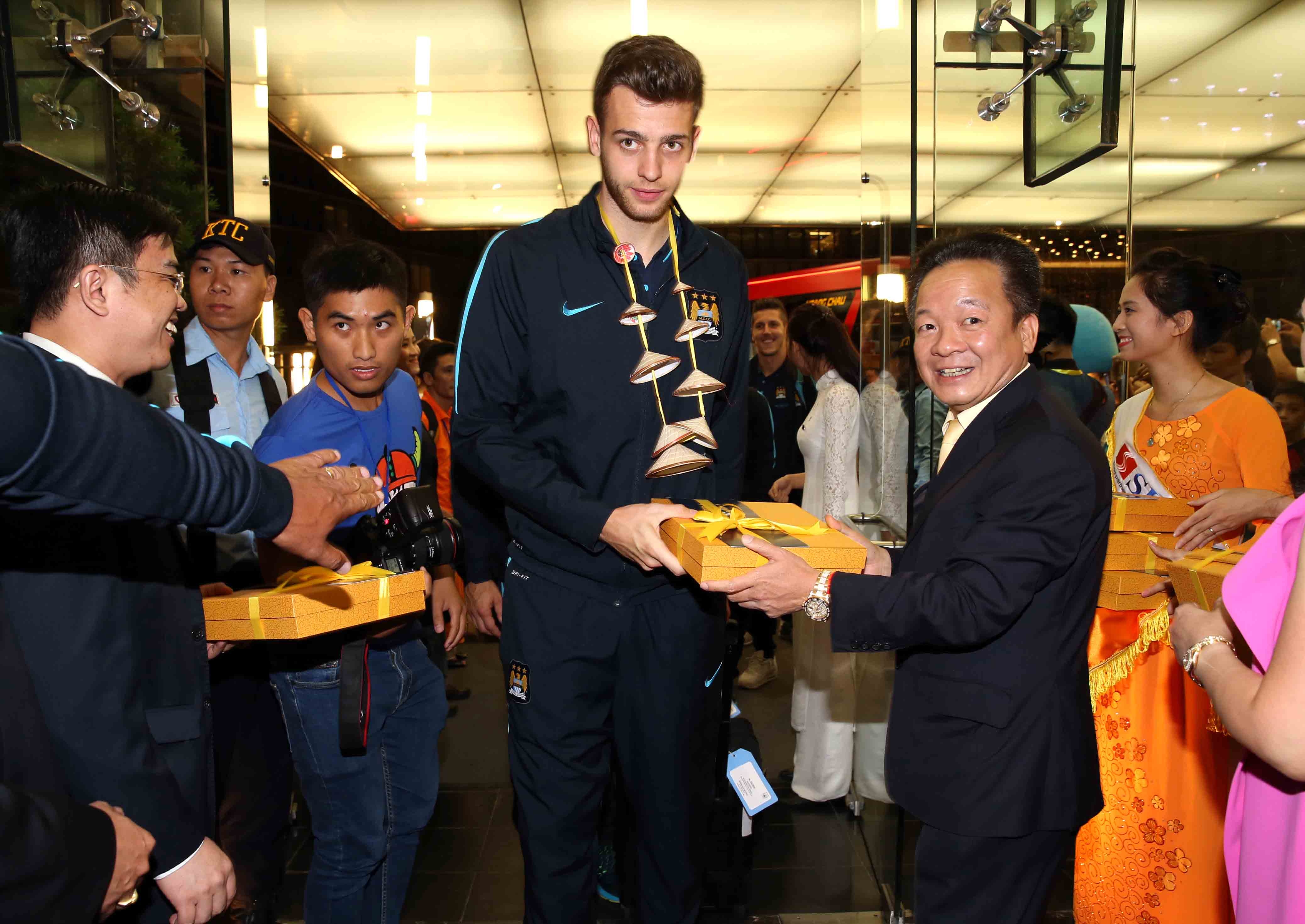 | Ông bầu của Hà Nội T&T trao quà cho từng thành viên trong đoàn Man City. Ảnh: SHB. |