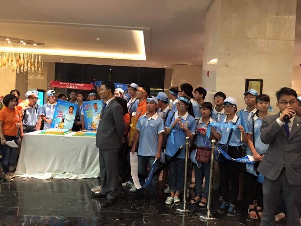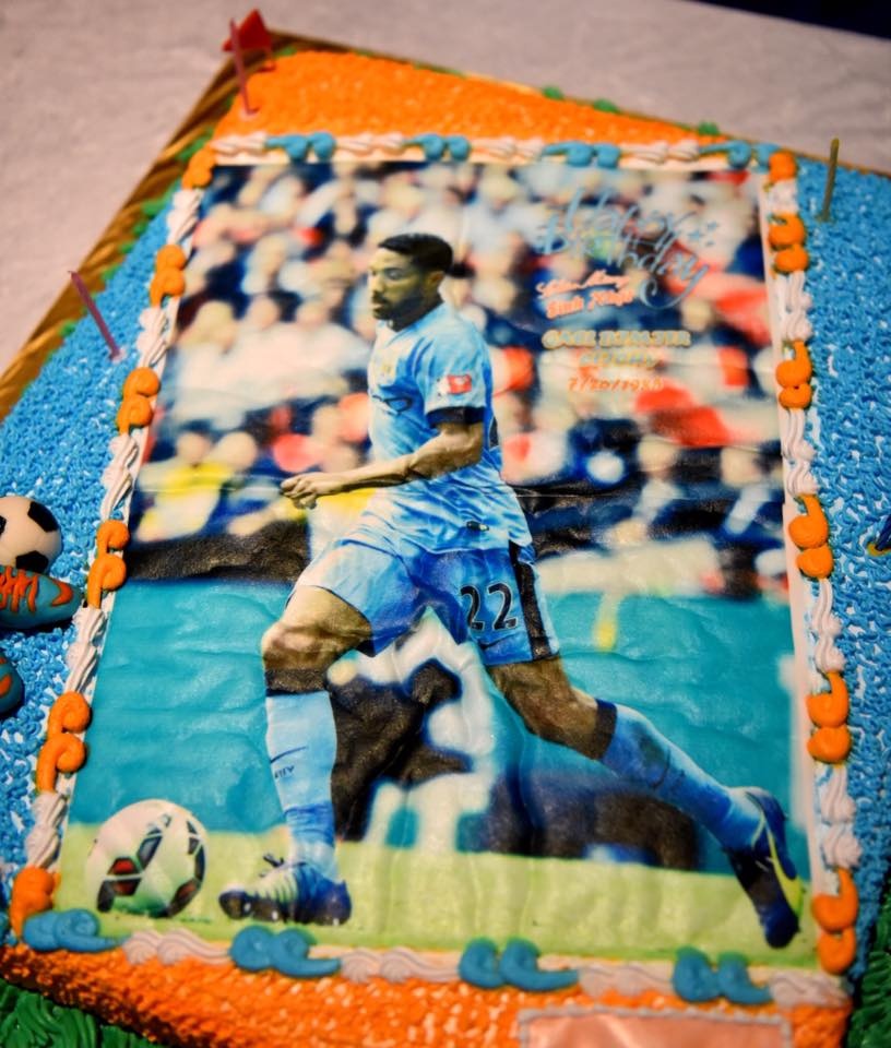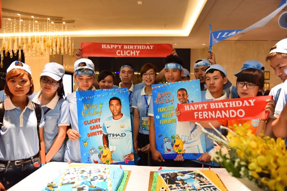 | Trước đó, khi Man City còn chưa tới Nội Bài, một nhóm người hâm mộ nửa xanh thành Manchester chuẩn bị sẵn bánh sinh nhật để chào đón tiền vệ Fernando và hậu vệ Gael Clichy tại khách sạn. Ảnh: Hoàng Hà. |