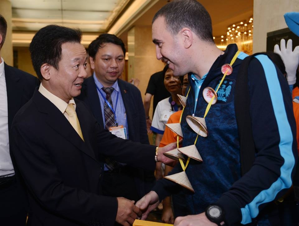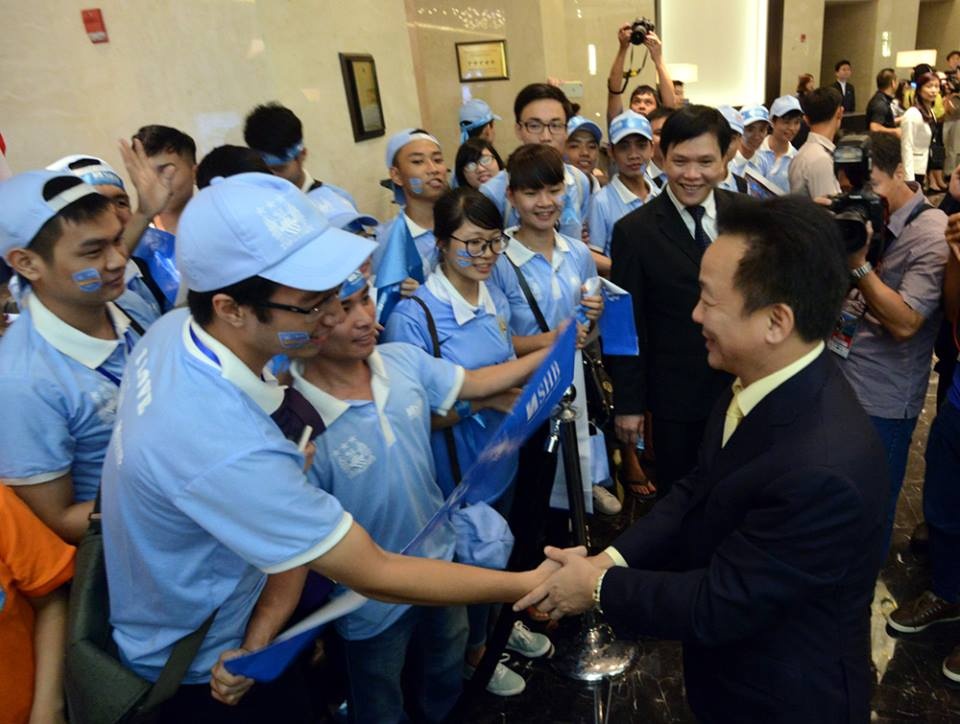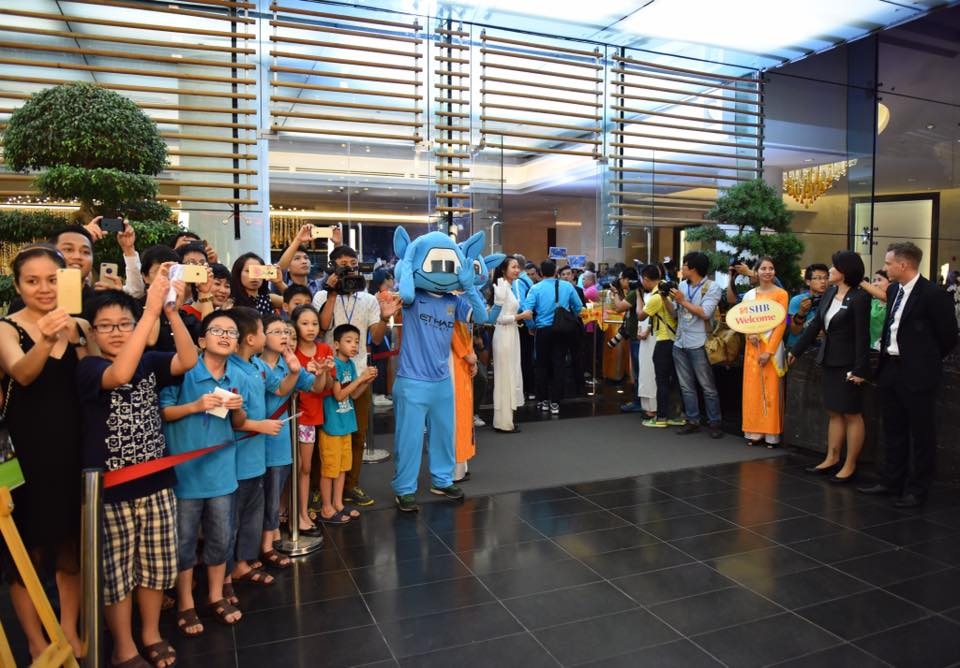 | Chủ tịch SHB, ông Đỗ Quang Hiển chào đón các thành viên của đoàn Man City tại khách sạn. Ảnh: Hoàng Hà. |