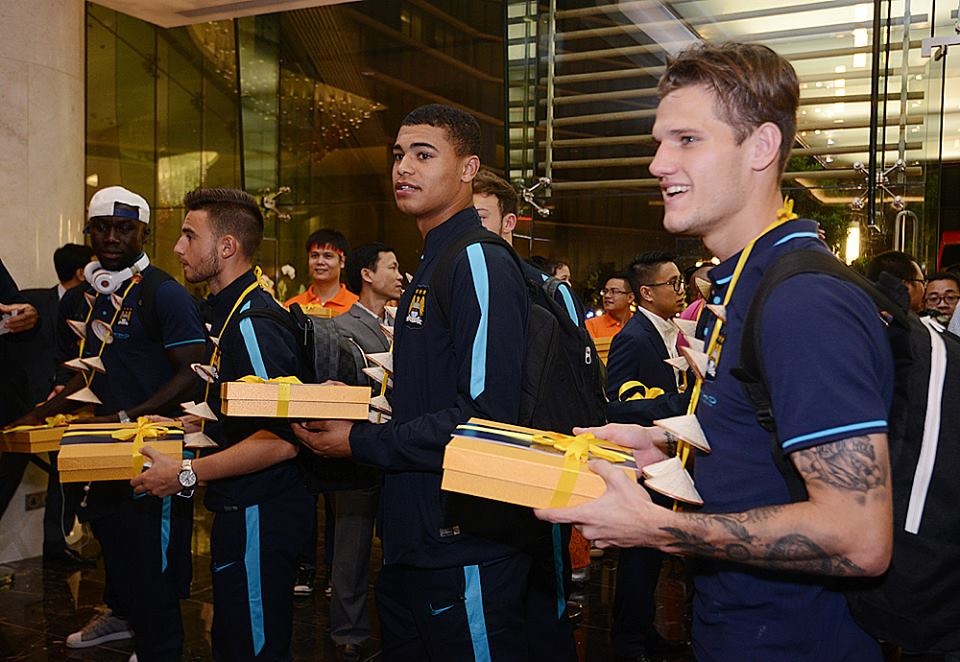 | Các cầu thủ Man City hào hứng nhận món quà từ bầu Hiển. Ảnh: Lê Hiếu. |