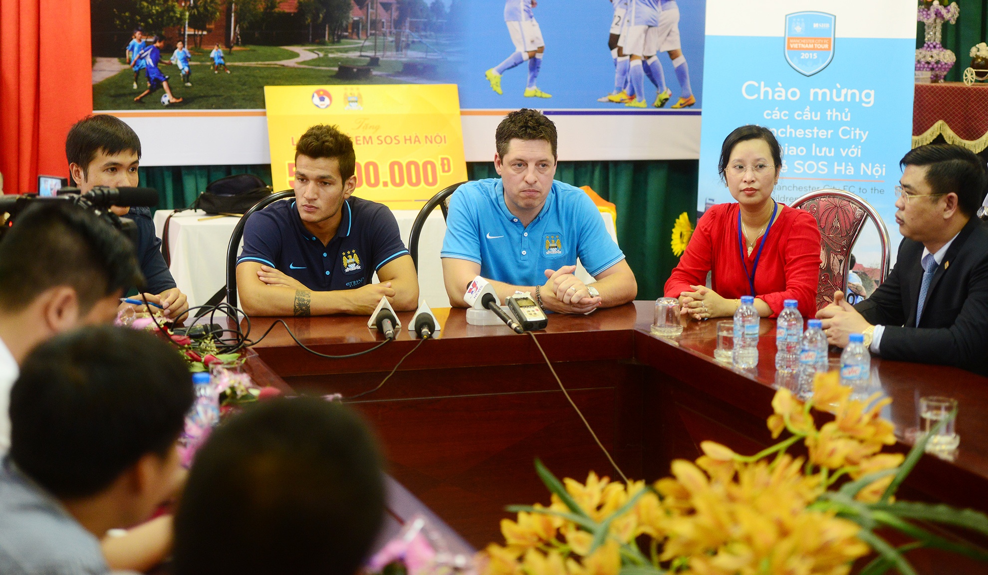 | Sau phần giao lưu, ông Simon Heggie (phụ trách truyền thông) và cầu thủ Marcos Lopez đại diện cho đoàn Man City trả lời phỏng vấn. Cả hai đánh giá rất cao sự đón tiếp nồng hậu và sự mến mộ "nửa xanh thành Manchester" nhận được tại Việt Nam. |