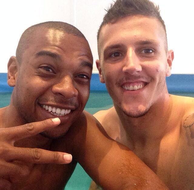 | Chân sút người Montenegro cùng đồng đội Fernandinho trong một lần đi tắm nước nóng. |