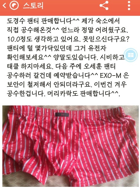 | Vốn sở hữu một lượng fan cuồng đông đảo, EXO từng gặp nhiều rắc rối nhưng đây là lần đầu tiên nhóm gặp tình huống trộm đồ lót oái oăm như vậy. Không chỉ rao bán “chiến lợi phẩm” từ Do Kyung Soo, cư dân mạng trên còn hứa hẹn sẽ trộm quần của Sehun. |