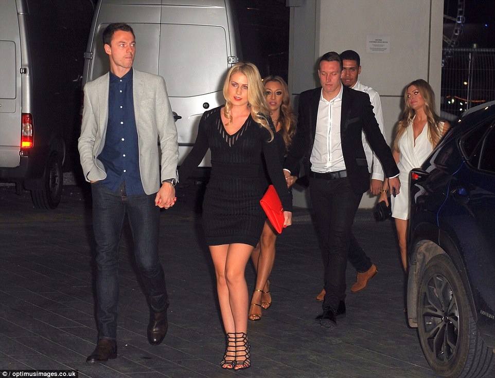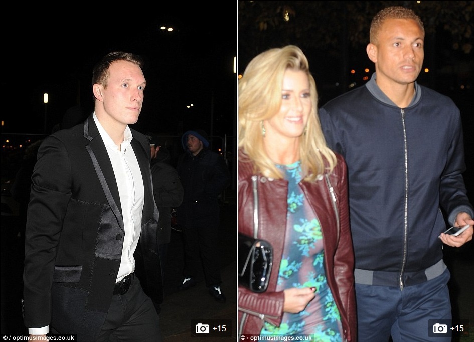 | Cặp trung vệ hiện tại của MU, Phil Jones (vest đen) và Chris Smalling (phía sau) cũng đưa bạn gái tới mừng sinh nhật người đội trưởng. |