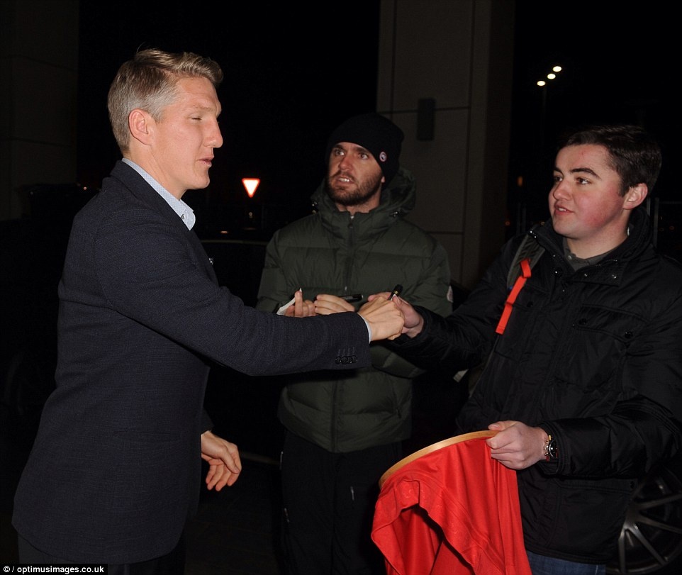 | Tuyển thủ Đức tặng chữ ký cho người hâm mộ "Quỷ đỏ" tại Liverpool khi trên đường tới khách sạn Hilton. |