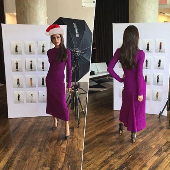 | Bà Beck diện bộ đầm màu tím nằm trong bộ sưu tập mới để chuẩn bị đón Giáng sinh sớm. |
