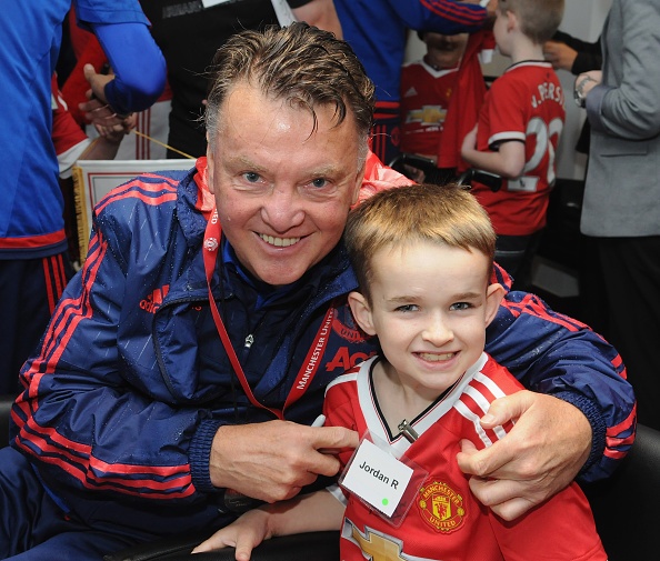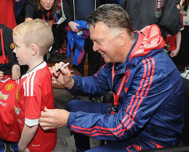 | Huấn luyện viên Louis van Gaal vui vé ký tặng lên áo đấu của cổ động viên nhỏ tuổi. |