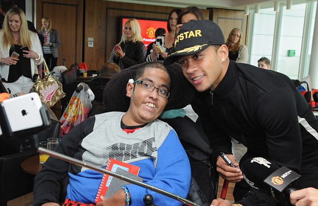 | Memphis Depay vui vẻ tự sướng cùng một em nhỏ có hoàn cảnh đặc biệt. |