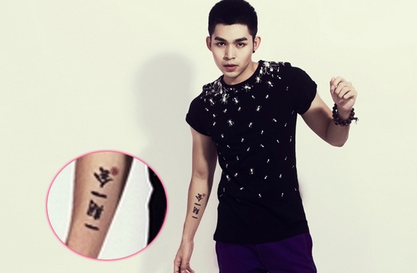 | Khánh Đơn: Sau màn cầu hôn ấn tượng trên sân khấu Zing Music Awards cuối năm 2014, cựu thành viên nhóm nhạc Huyền thoại tiếp tục thể hiện tình cảm sâu sắc với bạn gái bằng hình xăm trên cánh tay phải. Đây là những dòng chữ tiếng Hoa, trong đó có tên Lương Bích Hữu. |