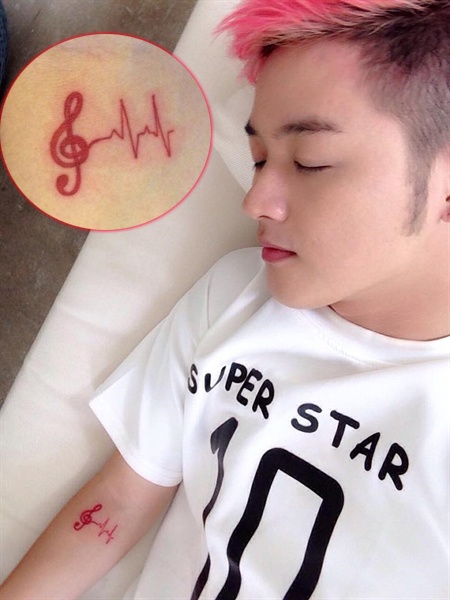 | Sơn Tùng M-TP: Hình xăm của nam ca sĩ nằm ngay khuỷu tay phải với dòng chữ “Sơn Tùng M-TP”, phía trên khung hình vuông chứa trái tim cách điệu màu đỏ rõ nét. Hình xăm này của Sơn Tùng khá giống thủ lĩnh của nhóm Big Bang. Nó được lấy cảm hứng từ Keith Haring, một nhân vật tiêu biểu từng đứng lên chống lại nạn phân biệt chủng tộc và kỳ thị người đồng tính ở Mỹ những năm 1980. |