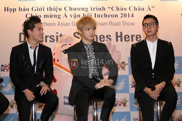| Tối 24/10, 3 chàng trai đã thực sự làm các fan Việt mãn nhãn với phần trình diễn xuất sắc các ca khúc trên sân khấu Chào Châu Á!, cổ động cho Á vận hội ASIAD 2014 tại Incheon. |