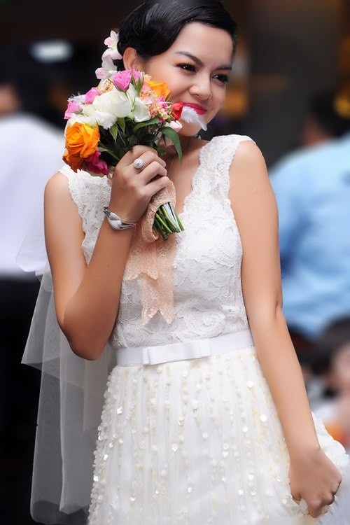 | Trà My Idol đang ở trong thời kỳ đầu của thai kỳ khi mặc váy cô dâu. Chiếc váy cưới đính 3.000 viên pha lê sang trọng và quyến rũ giúp nữ ca sĩ khoe vóc dáng đẹp. Cô thường chọn giải pháp chụp ảnh giấu bụng với bó hoa cưới. |