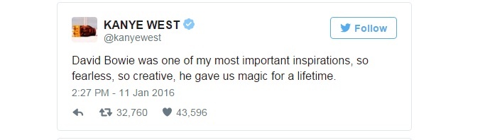 Kanye West nhắn nhủ với người hâm mộ trên Twitter: "David Bowie là nghệ sĩ truyền cảm hứng, sự can đảm và sáng tạo quan trọng đối với tôi. Ông ấy mang đến sự kỳ diệu cho cuộc đời mỗi chúng ta".